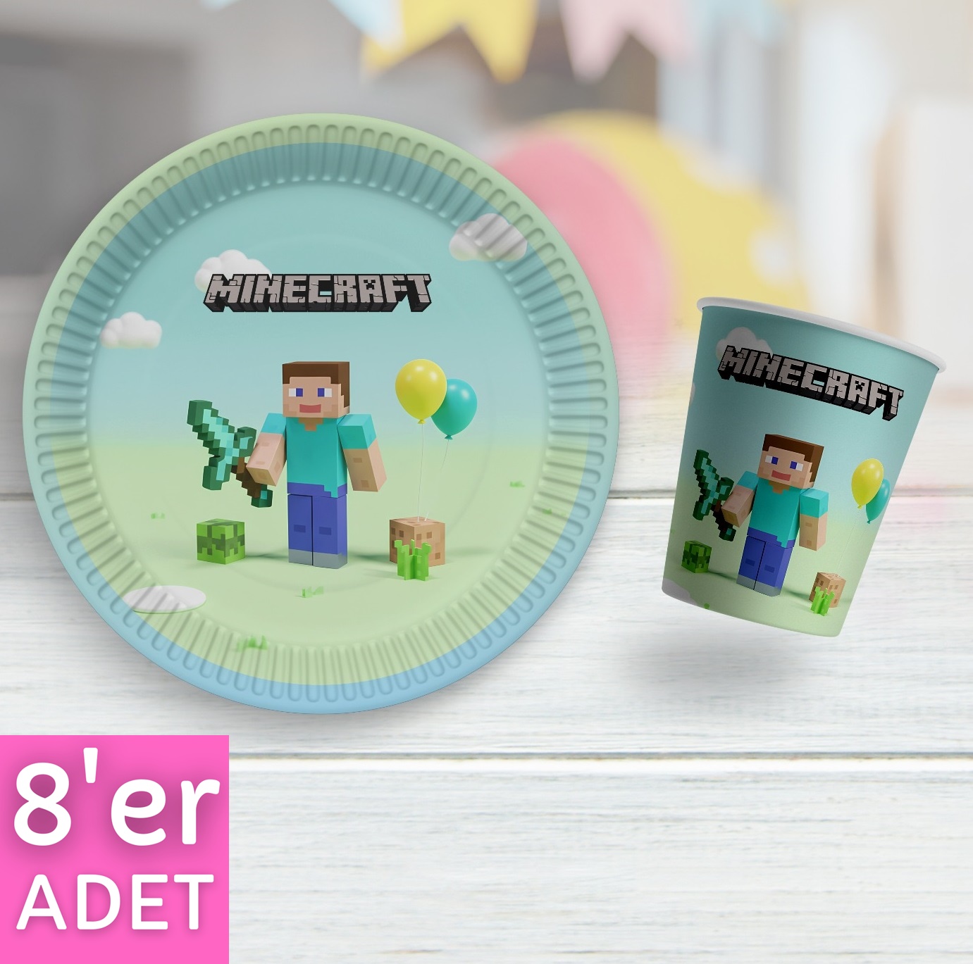 Minecraft dünyasının renkli enerjisini yansıtan bu toptan baskılı karton tabak bardak seti ile partiler artık çok daha özel! Siz de mağazanızda veya online satış kanalınızda bu ürünü bulundurmak istiyorsanız, hemen sipariş verin ve stok avantajlarından yararlanın.